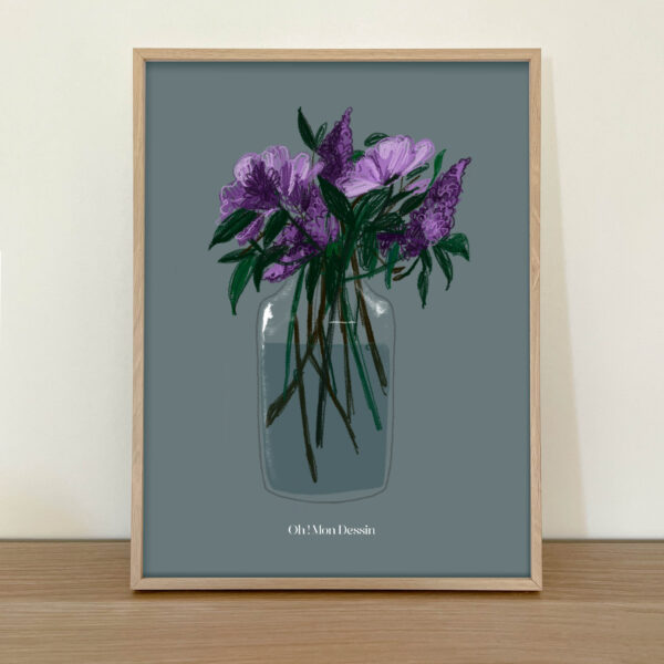 15,00 € – 34,00 €Cette affiche représente un bouquet de fleurs violettes et de lilas dans un vase en verre, avec un joli fond gris. Elle apporte une touche naturelle et colorée qui s’intègre facilement dans tout type de déco. Parfaite pour ajouter un peu de fraîcheur et de douceur à votre espace.