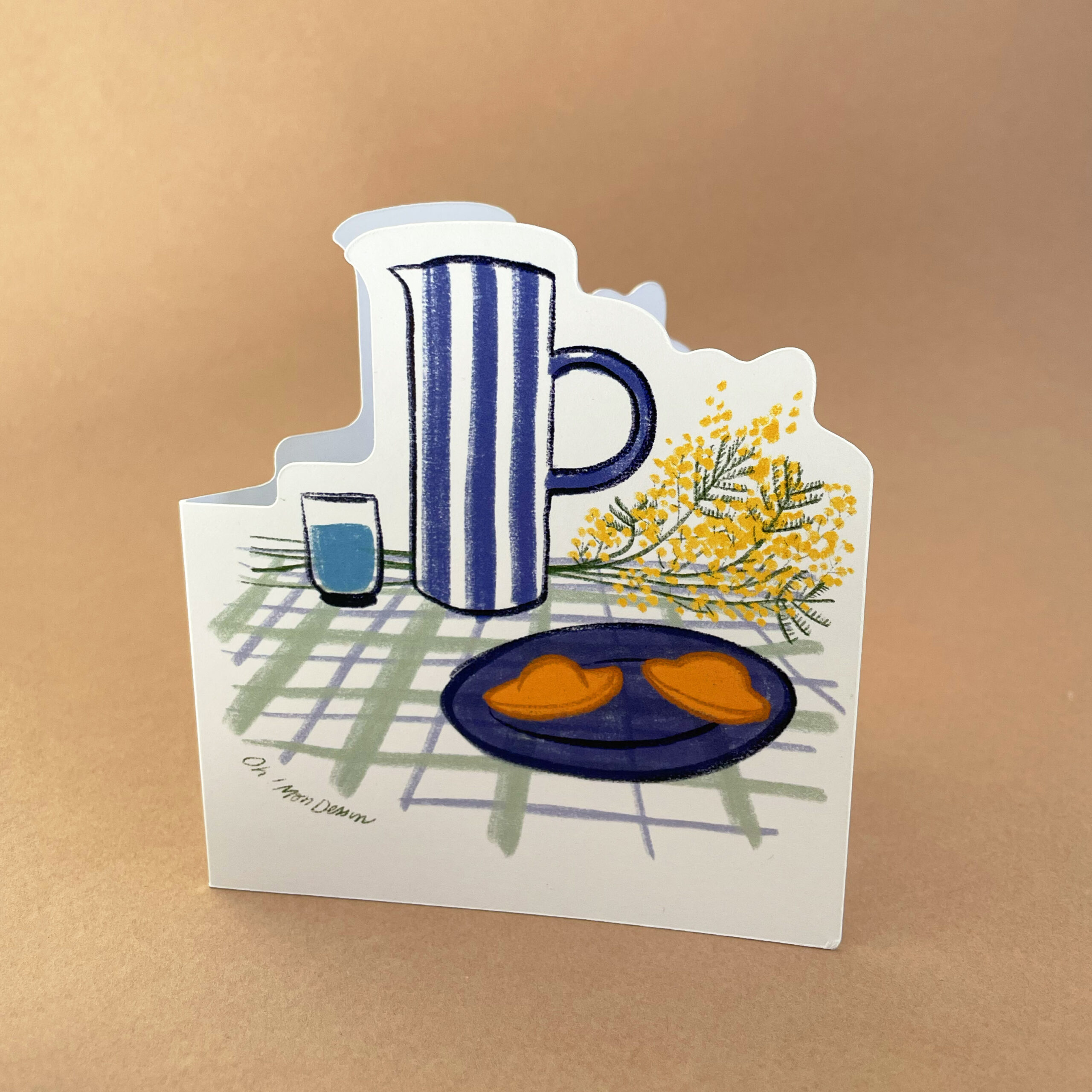 Cette carte découpée évoque les instants doux du quotidien, ces pauses gourmandes partagées (oh ! miam des madeleines !) ou savourées tranquillement chez soi.